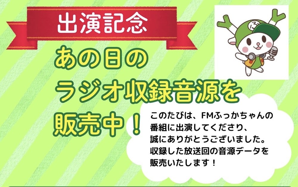 このたびは、FMふっかちゃんの番組に出演してください、誠にありがとうございました。収録した放送回の音源データを販売いたします!
